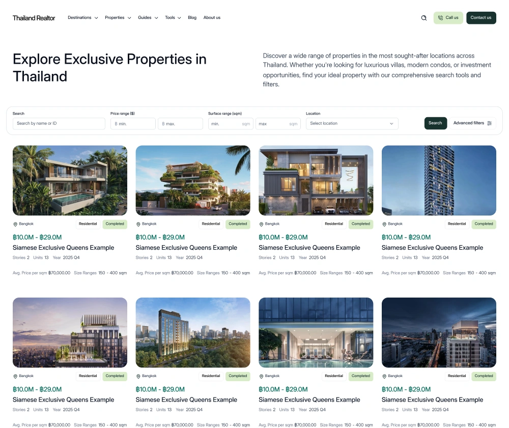Dizajn i razvoj web stranice za posrednika u prodaji nekretnina na tajlandskom tržištu , s fokusom na jasnu prezentaciju ponude, izgradnju povjerenja stranih kupaca i konverziju posjetitelja u kvalificirane upite.
